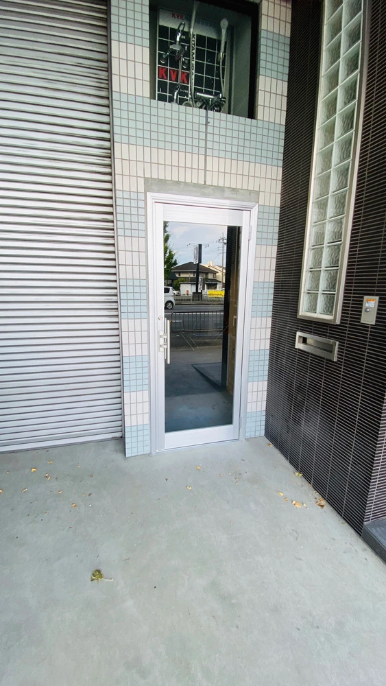 お客様が出入りする入り口にしたいとのことで、ガラス張りの玄関サッシにしました。中の様子が分かるので、お客様も安心して入ることができます。