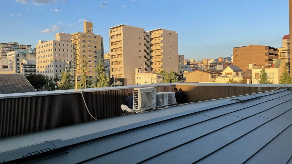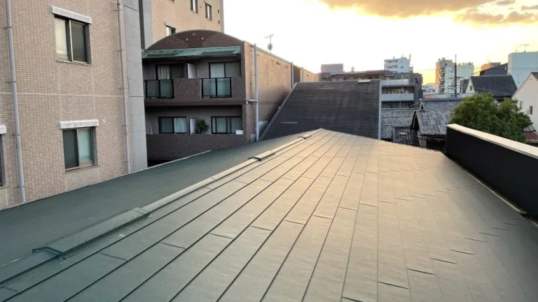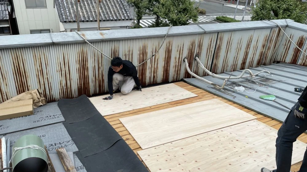 雨漏りがする事務所の屋根を調べてみると、雨どいにヒビが入っていることがわかりました。屋根自体も劣化が進み防水層(ルーフィング)の耐用年数も過ぎていたため、全面的に葺き替えることにしました。野地(屋根の骨組み)を合板で補強し、ルーフィングを一新した上で耐久性の高いガルテクトで葺き替え、数十年先まで安心な屋根が完成しました。