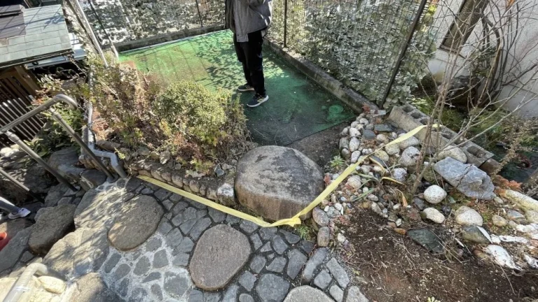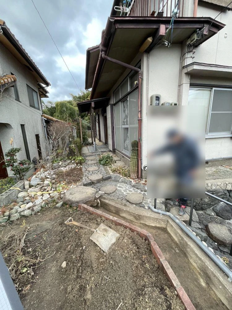 そのまま残すガレージの壁や敷石部分を破損させないよう、慎重に作業を行いました。