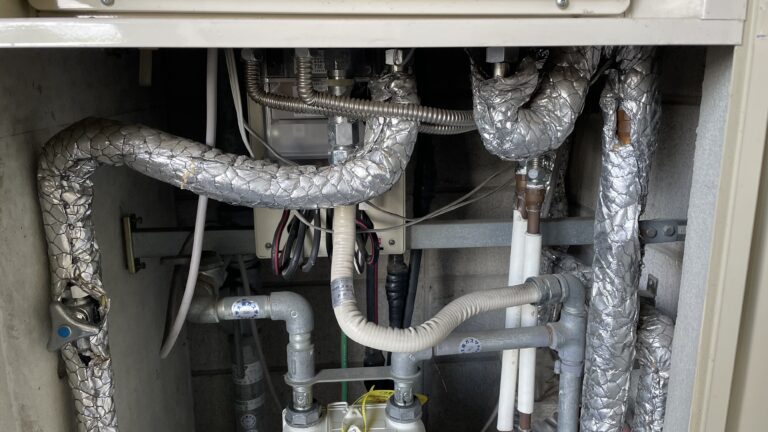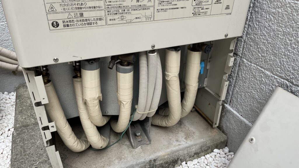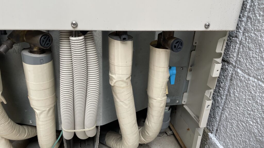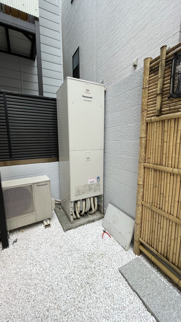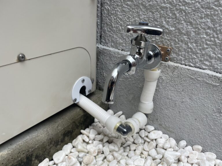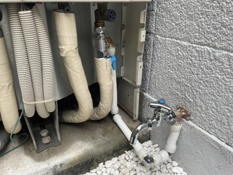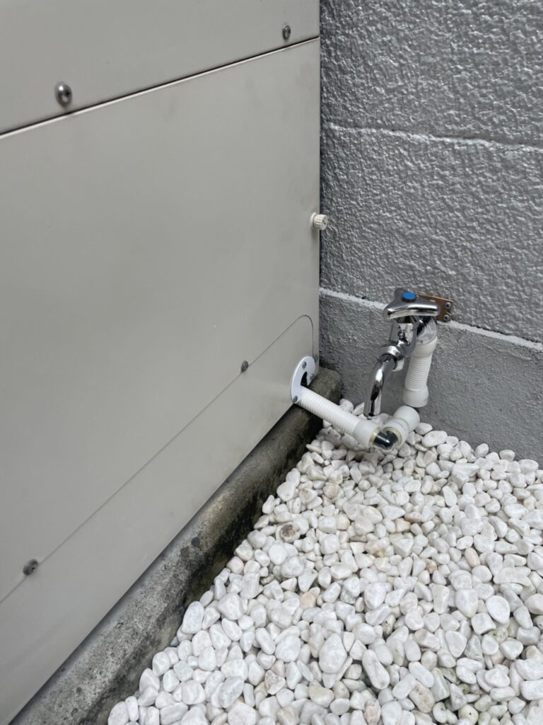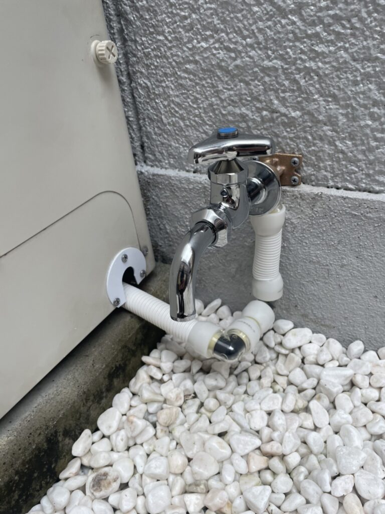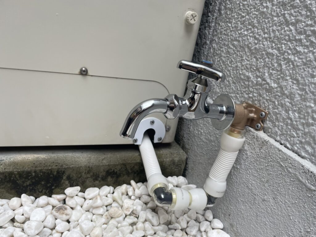 トイレとエコキュートから水栓を分岐し、お庭でお湯の出る水栓を増設した事例です。トイレとエコキュートの配管を利用することでリーズナブルな金額に収めることができました。