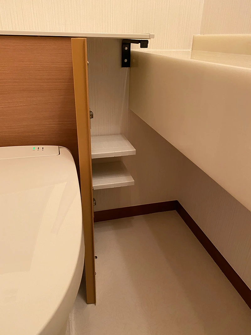 両側についた収納棚には、トイレットペーパーや掃除道具を入れることができます。さっと取り出しやすいので、頻繁に出し入れする小物を収納すると便利。