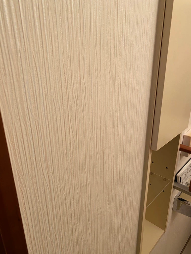 収納棚付きトイレ「リフォレ」の施工例です。リフォレは一見タンクレスに見えるすっきりデザインで人気です。背面の収納棚には細々としたものを収納できます。今回は壁紙とフロアの素材をラメ入りにし、明るさが感じられる空間になりました。