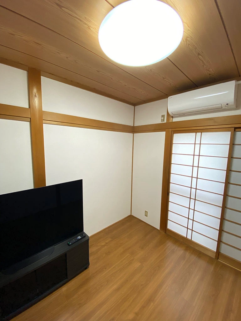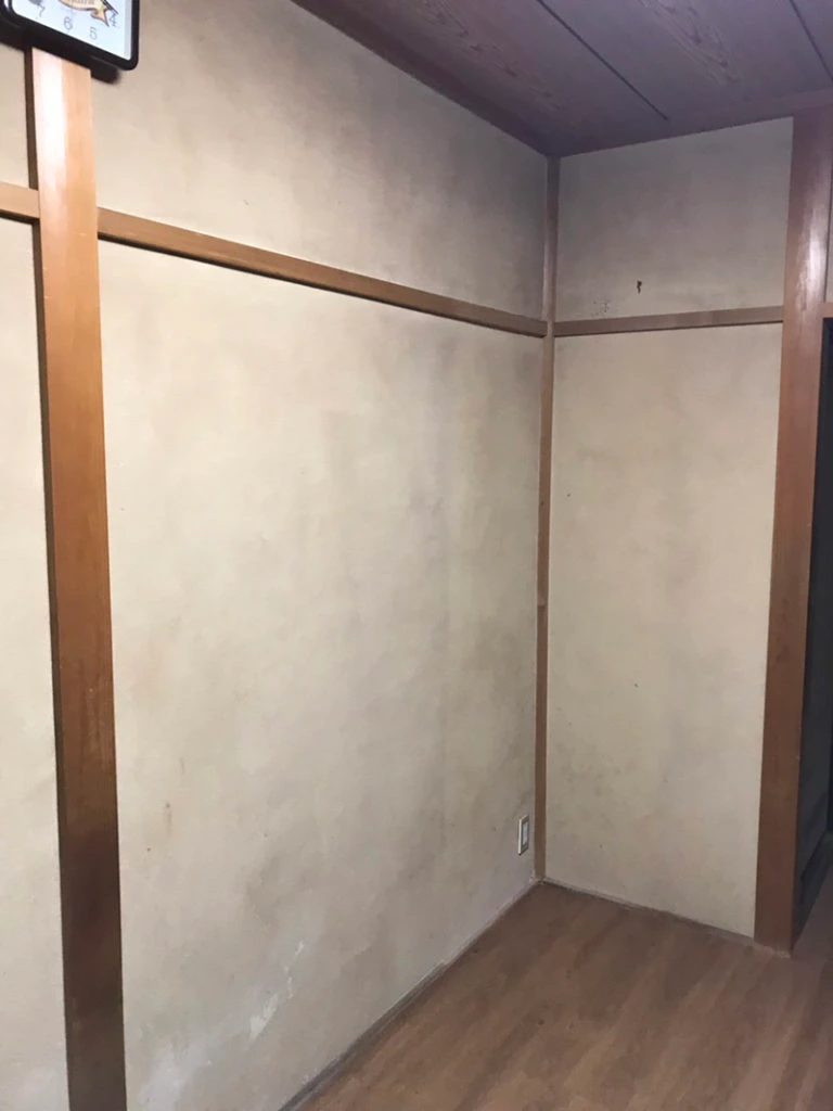 黒ずんだ土壁はベニヤを上張りして、その上からクロスで仕上げました。柱や鴨居は残りますが、逆にそれが味になって、和の雰囲気を残した洋間になりました。