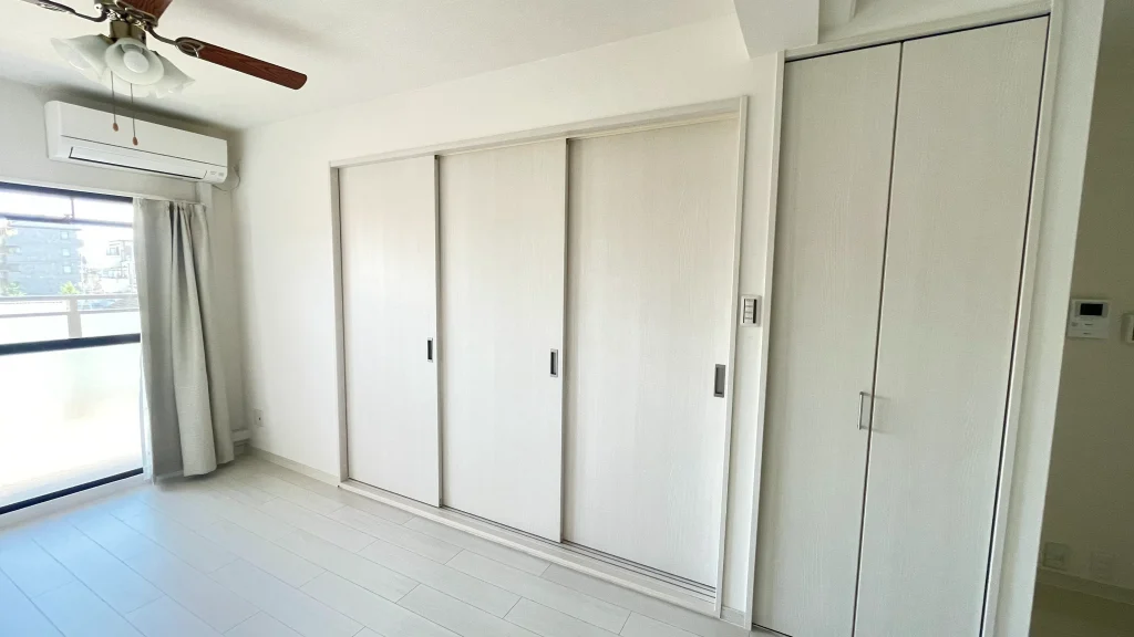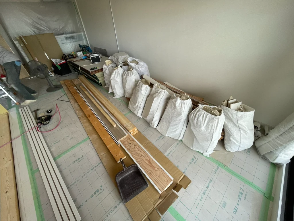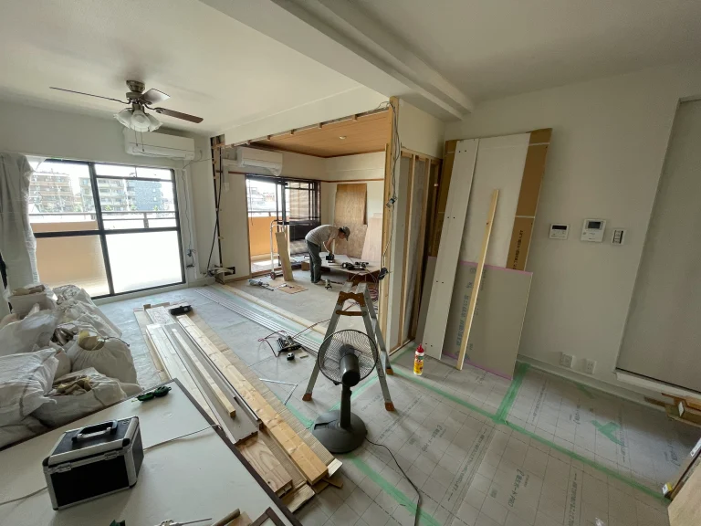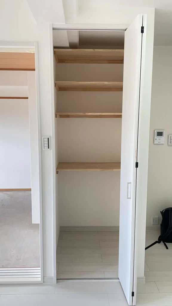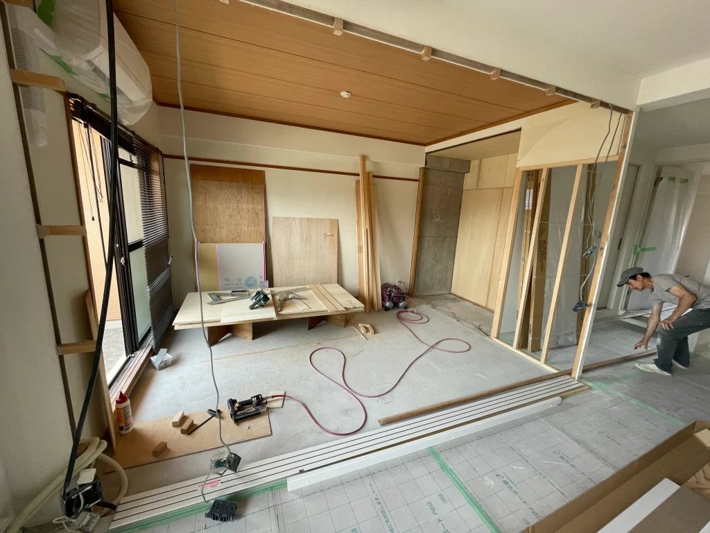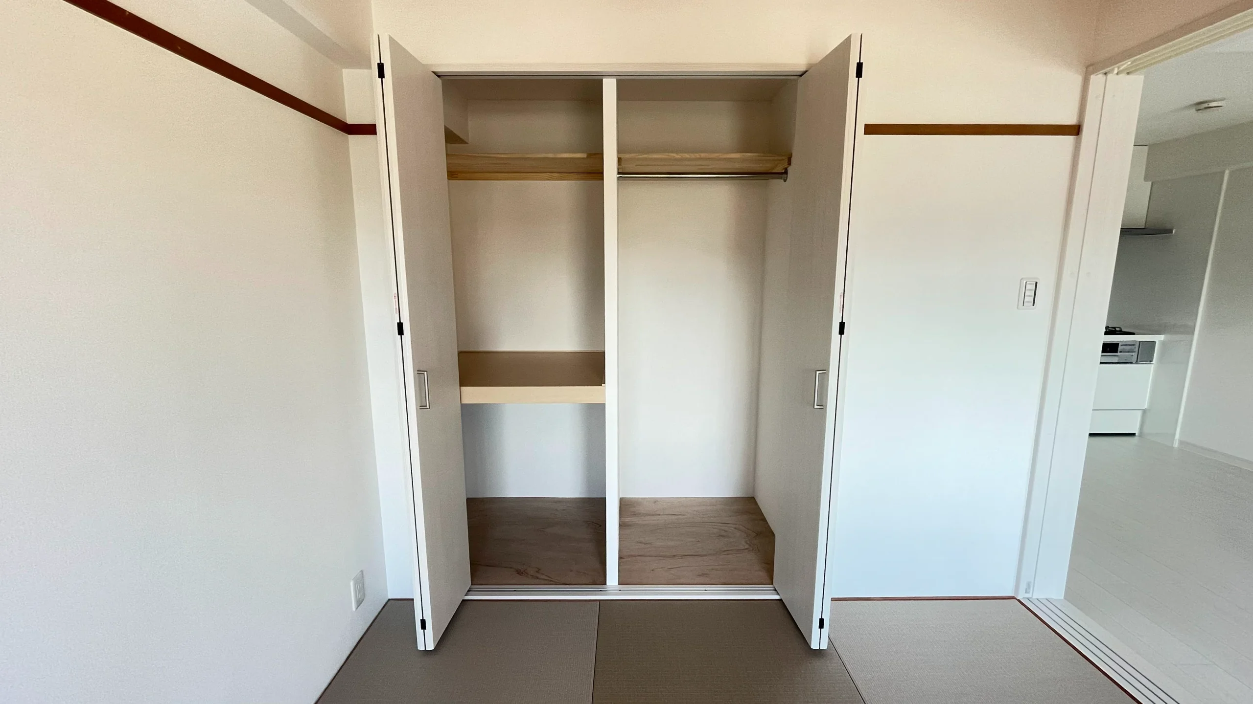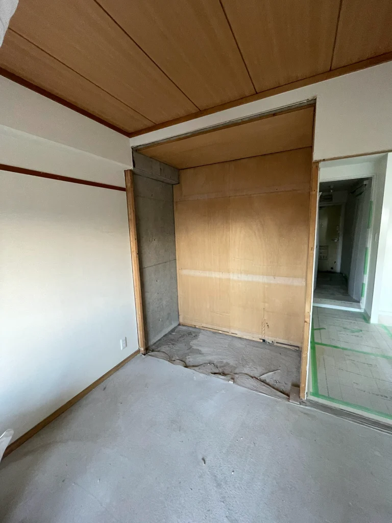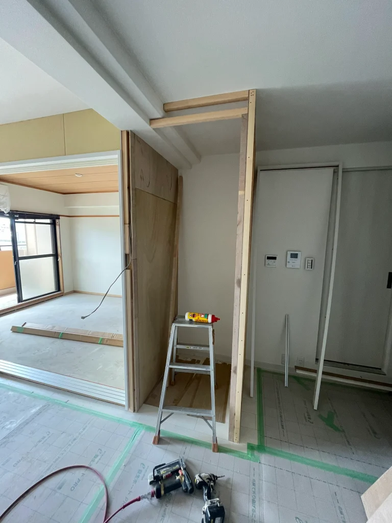 | 主なリフォーム内容 | ・LDK・和室間仕切り解体 ・LDK間仕切り扉設置 パナソニック「ベリティス」3枚片引き戸 ・押入れからクローゼットへ改修(1.0間) ・クローゼット新設(0.5間) ・新規半畳畳 ダイケン フチナシ和紙畳 ・クロス張替え |
