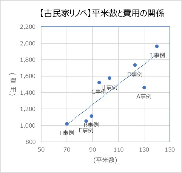 みやこリフォームで築40年以上の古民家をリノベーションした事例の費用を分析すると、次の通り、施工面積の分だけ費用が比例して増えることが分かりました。