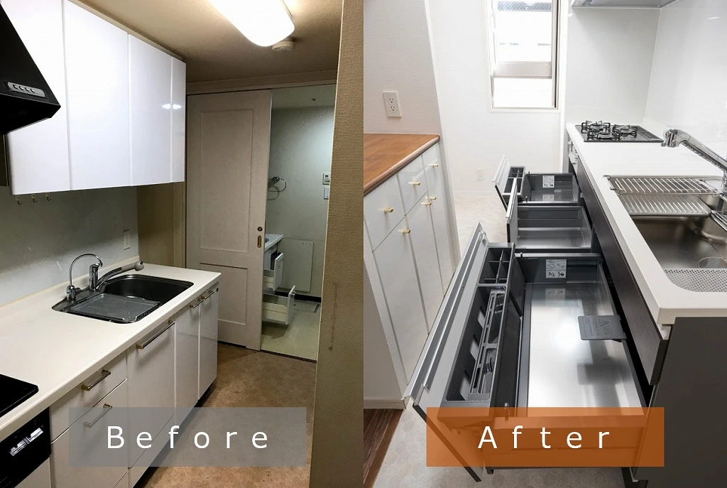 リクシルの売れ筋システムキッチン「シエラ」を導入したリフォーム事例になります。収納量が増え、使い勝手がよくなるように、引き出しタイプのシステムキッチンを提案しました。