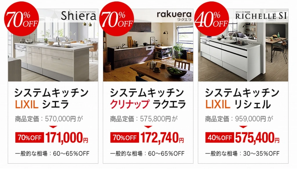 特に、リクシル製品については、特別価格での仕入れを実現しており、リクシルのシステムキッチン「シエラ」や、クリナップのシステムキッチン「ラクエラ」は定価の70%オフでご提供することが可能です。