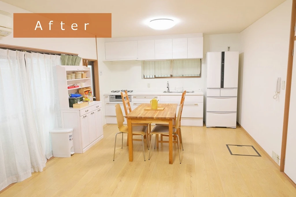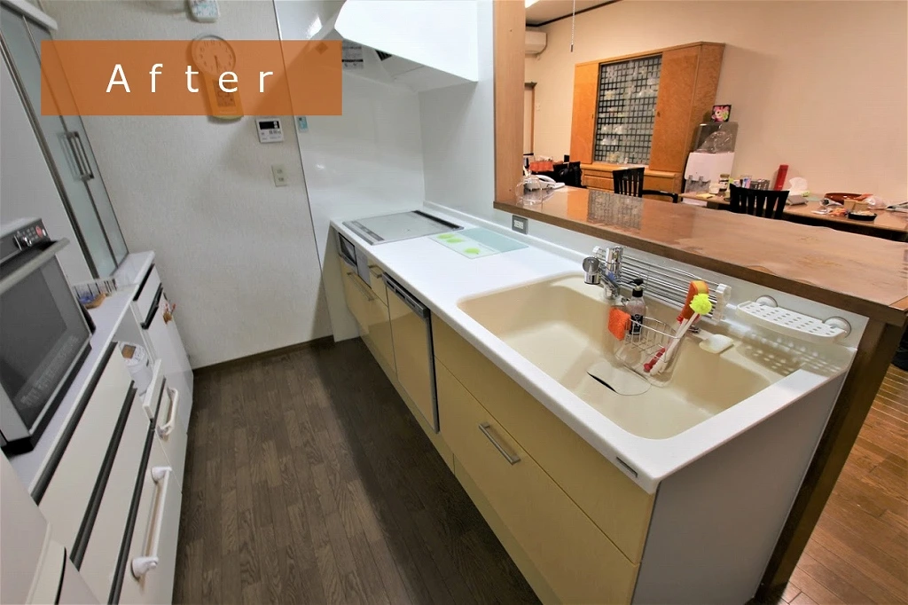 リクシルの最高級システムキッチン「リシェル」を導入したほか、キッチン・ダイニングと隣合う畳の間を含めて、フローリングの張替え、クロスの張替えも行ったリフォーム事例になります。