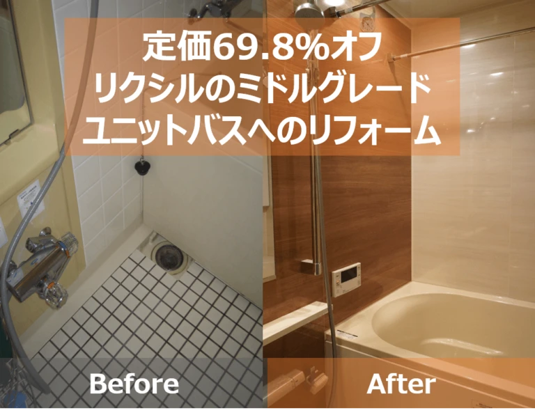 ユニットバスは極力費用を抑えるために、売れ筋のミドルグレードのユニットバスを導入しました。ミドルグレードの場合、割引率は定価の50~60%オフほどが相場になりますが、弊社では69.8%オフでご提供できました。