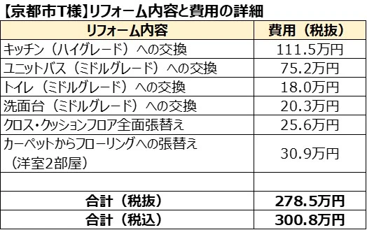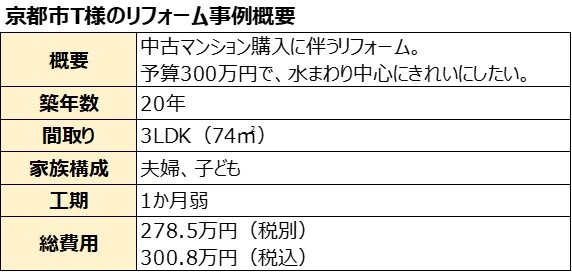 ここでは、みやこリフォームの実際のマンションのフルリフォームの事例(京都市T様の事例)を通じて、300万円でどのようなリフォームができるのか見ていきましょう。