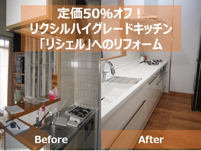 リクシルのハイグレードキッチン「リシェル」へのリフォームになります。ハイグレードの場合、割引率は定価の30~40%オフほどが相場になりますが、弊社では50%オフでご提供できました。
