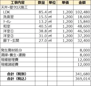 「実際に詳細な見積りを見てみたい!」という人もいるかと思います。そこで、ここでは、みやこリフォームで施工したマンションの壁紙張替えの見積りを大公開します。