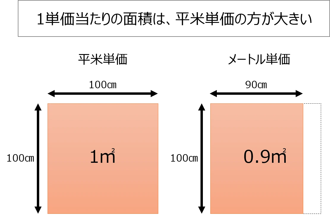 なぜなら、同じ「単価1000円」でも、対象としている面積はメートル単価の方が平米単価より小さいためです(下図参照)。