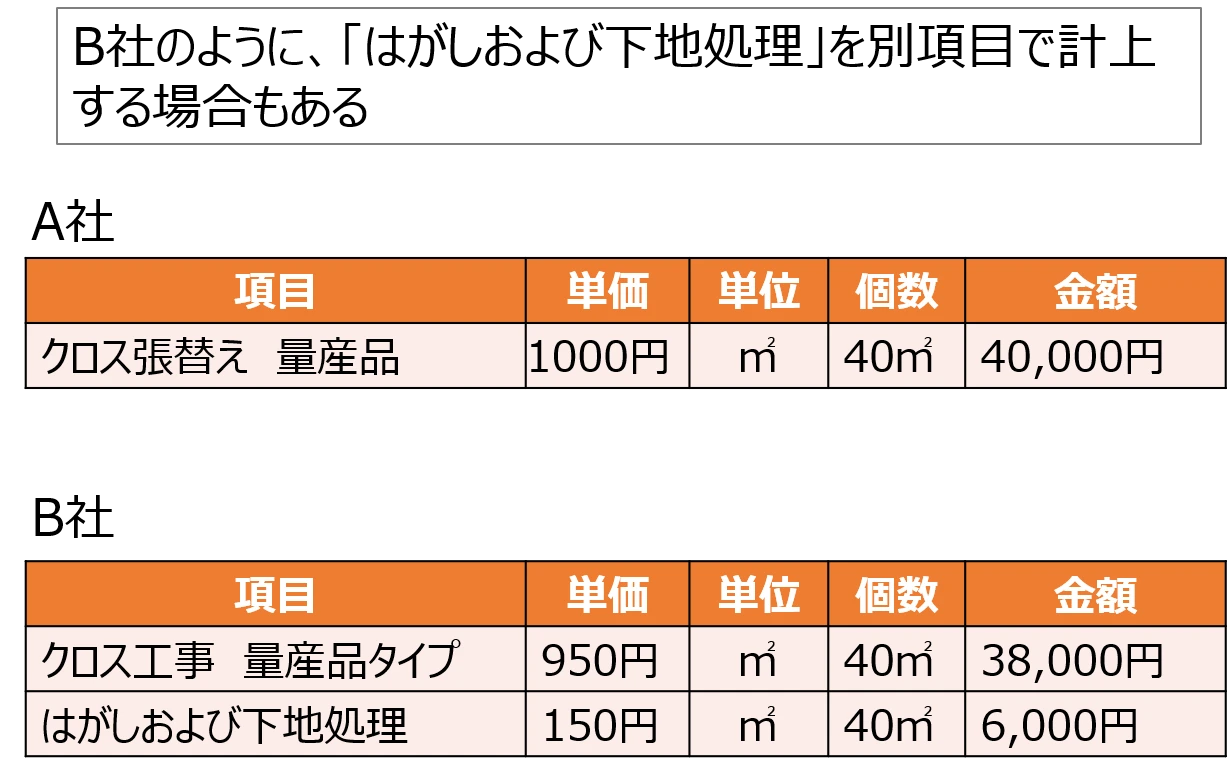 業者によって、「クロス張替え(量産タイプ)1150円/㎡」と見積りに記載する業者もいれば、「クロス張り工事970円/㎡」「既存クロスはがしおよび下地処理180円/㎡」ともともとのクロスのはがし代などを別計上する業者もいます。