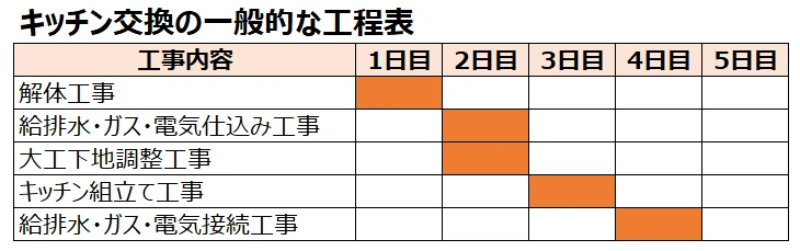 なお、単純なキッチン交換のほかに、クロスや床などの内装のリフォームも行うのであれば、5日以上かかる場合もあります。