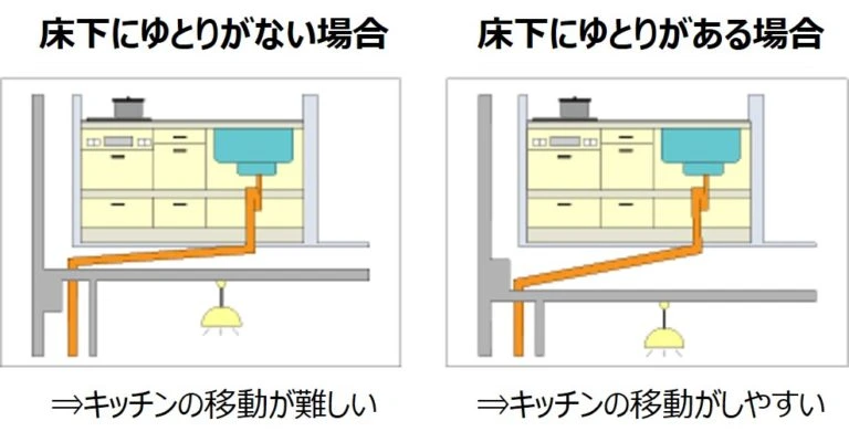 そのため、上図のように、「床下にゆとりがない場合」は配管の傾斜がとりにくいため、キッチンを移動される範囲が限定されることが多いです。一方で、「床下にゆとりがある場合」のように配管の傾斜がとれる場合は、ある程度大きくキッチンを移動させることができます。
