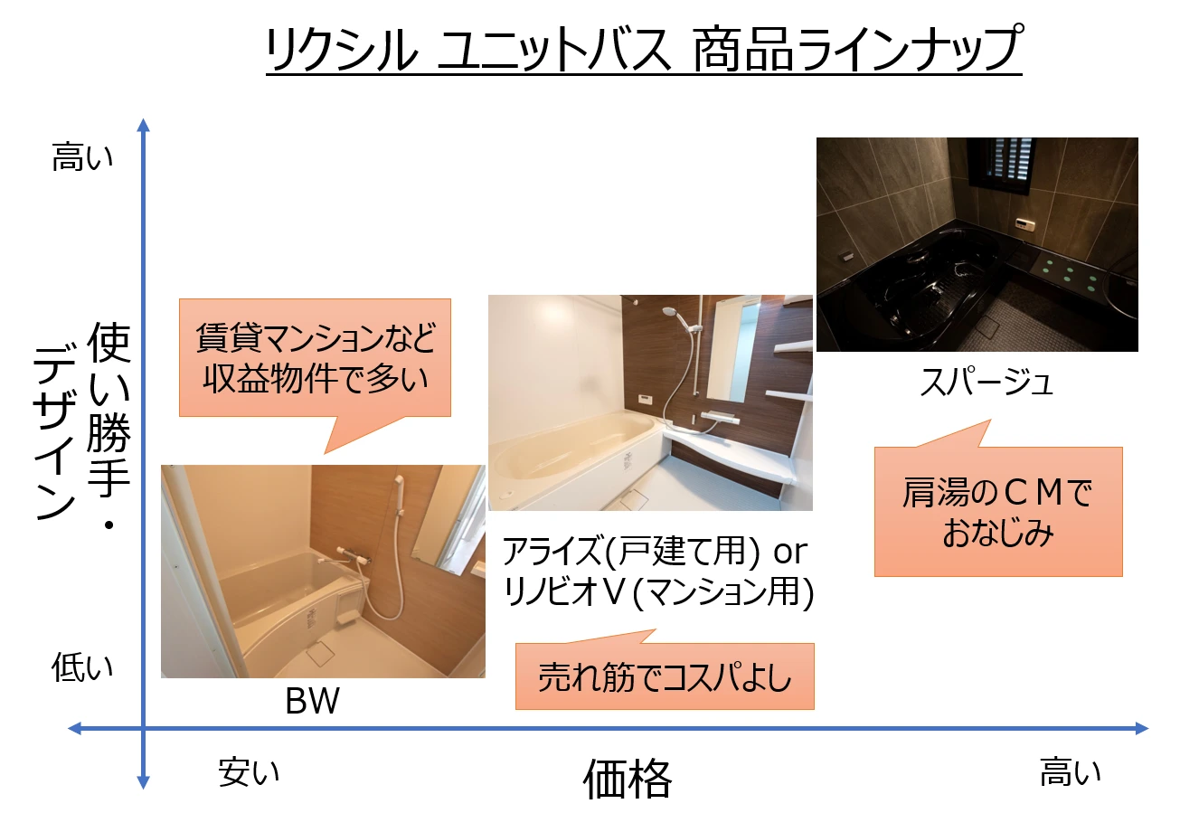 リクシルでは、集合住宅向けの低コストモデルとして「BW」、ミドルグレードの売れ筋ユニットバスして、戸建て向けに「アライズ」、分譲マンション向けに「リノビオV」を発売しております。