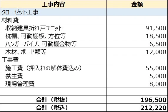 そこで、ここではみやこリフォームの実際の見積りを通じて、押入れからクローゼットのリフォーム費用の詳細をご説明します。